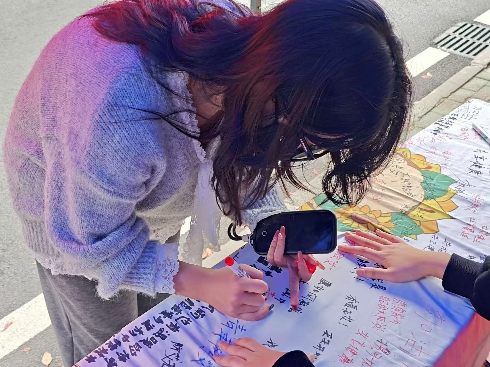 宣讲结束后,同学们来到崇真广场,一起开展“‘艾’的抱抱”“防艾漂流瓶”等一系列防艾小游戏。在放松身心的同时,这些小游戏也有效纠正了大家谈“艾”色变的观念,让理解与勇气的力量在彼此的互动中传递。随后,在印有防艾版服务队虚拟人物形象“阳小益”的画布上,同学们留下自己的心得体会和温情寄语:“知爱止艾,人人有责”“用爱防艾,你并不孤单”……