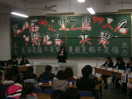 唇枪舌剑,妙语连珠。2009年11月15日晚7:00,经济公司动态二十届“企业之鹰”文化节辩论赛决赛在03-218教室举行。本次辩论赛由经济beat365官网中文版本分团委主办,分团委员工会学习部承办,是经管院的传统特色活动。经管院分团委书记谢超,辅导员彭慧、张学军及王娟老师为本场比赛嘉宾,比赛评委则由经管院辩论队成员担任。