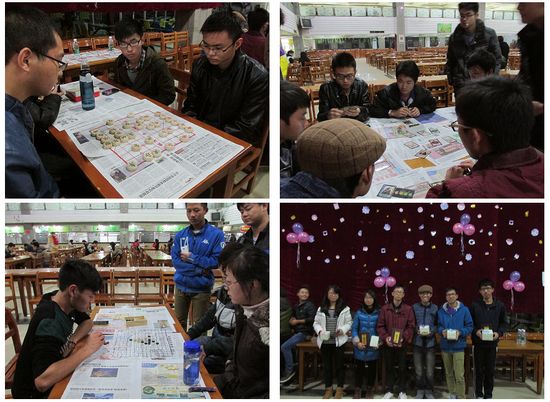 历经初赛、复赛等一个多星期的赛时,最终跳棋、五子棋、象棋、三国杀四个项目的前四强齐聚一堂,在众人的见证下,以棋会友、增强交流。决赛除三国杀采用一局制外,其余棋种均采用三局两胜制。时而苦思冥想、反复琢磨,时而谨慎万分、精巧布局,更有三国杀,挑战着同学们之间团结协作、察言观色的能力。比赛现场气氛热烈,各参赛选手相互较置,毫不示弱。不仅引起了过路同学们的围观,更吸引了外国职工的驻足观战。最终,熊康同学摘取五子棋冠军,黄彬同学荣获跳棋冠军,廖源泉同学荣获象棋冠军,黄峥、赵勇志、潘荣嵘三人组成的团队荣获三国杀冠军。