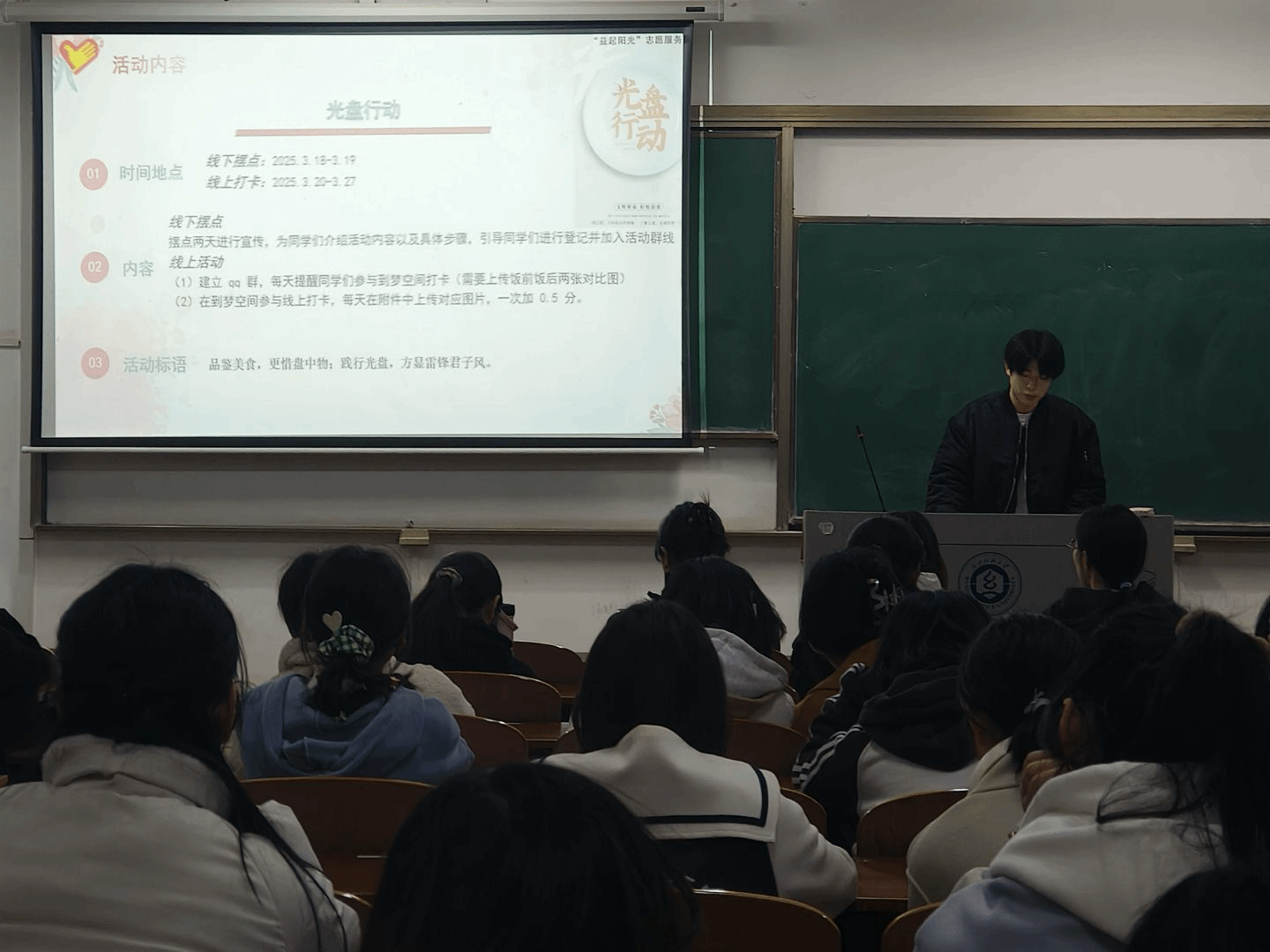 随后,公益活动部陈朱同详细介绍了“益起阳光”志愿服务队的月度计划。三月是雷锋月,为了让雷锋精神在新时代绽放更璀璨的光芒,“益起阳光”志愿服务队在原有的“金晖助老”“阳光领航计划”两个活动的基础上,新增了“光盘行动”“财务知识问答·书签画雷锋”的活动。雷锋月系列活动将通过设点宣传的形式来传播雷锋精神,培养同学们的良好习惯,将学雷锋融入日常。此外,陈朱同还明确了雷锋月系列活动中各部门的分工及注意事项。