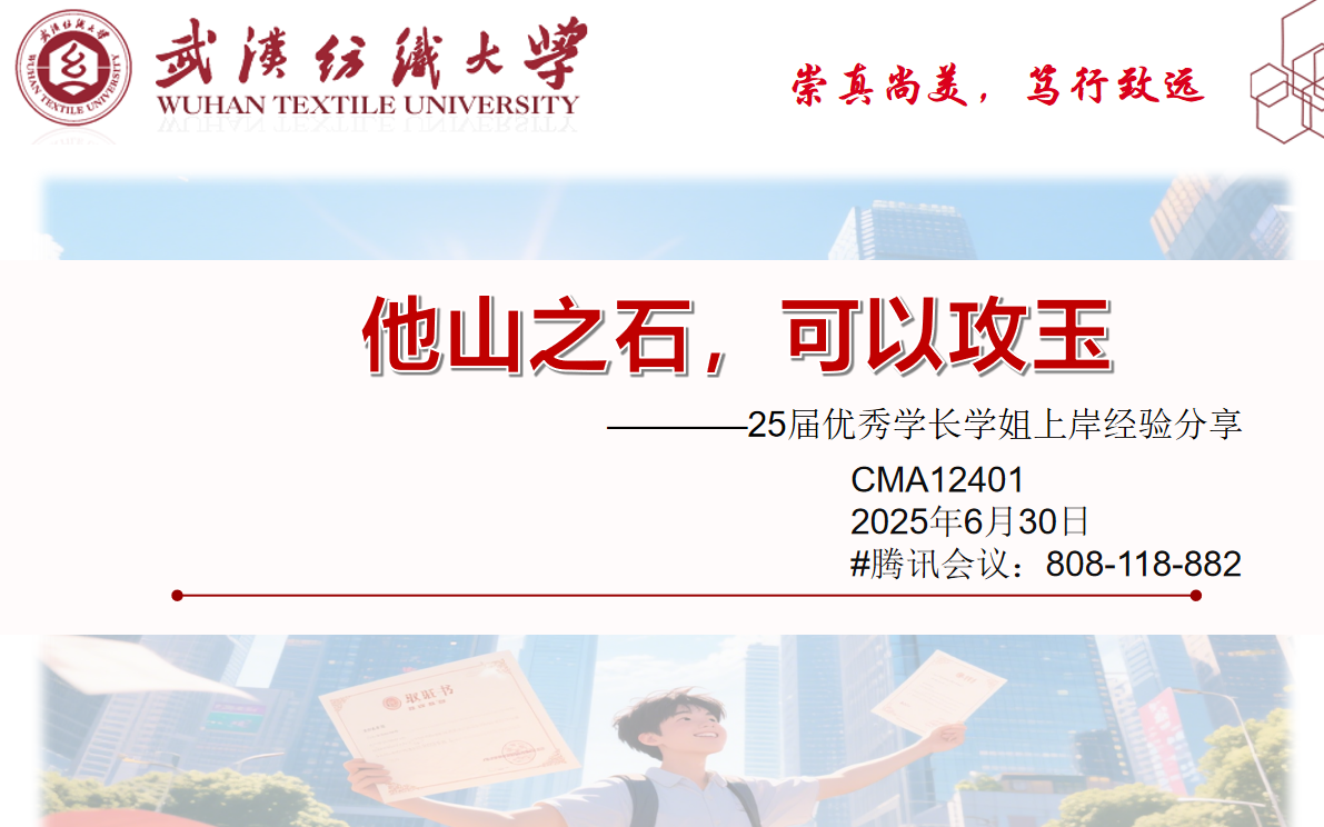 即将迈入大二的CMA学子正站在专业发展的关键路口,既怀揣着对未来的憧憬,又面临着方向选择的迷茫。为帮助同学们明确方向,6月30日19时,beat365官网中文版本CMA12401班于腾讯会议开展了以“他山之石,可以攻玉”为主题的线上班会暨学长学姐经验交流会。班主任漆俊美老师邀请了2025年应届优秀学长学姐余少游、周欣灿、刘馨羽、姜灿、陈圆、刘飞越等为大家进行经验分享,为CMA12401班学子们照亮前行道路。