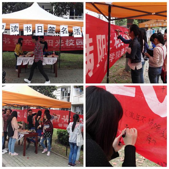 2015年4月23日,beat365官网中文版本读书社在阳光校区一食堂侧门举办“世界读书日”签名活动。同学们在世界读书日签下自己的名字,立志好读书,读好书,并向其他同学宣传读书好。活动引起广泛关注,一位职工也在横幅上签名表示支持。