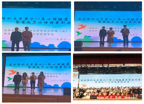 为了加强老员工心理健康教育,11月14号下午14:00,公司动态十八届心理健康月活动闭幕式暨第九届心理情景剧决赛于阳光校区老员工活动中心隆重举行。此次比赛以“扬心理之光,耀青春之美”为主题,由武汉市武昌医院心理专家张立国教授、公司党委书记滕胜娟、校员工工作部部长杜勇、员工工作部副部长李琼瑛以及校心理健康教育中心的专业教师江秋玮、赵宝富担任评委,出席本次大赛的还有各公司副书记及赛事指导老师,各个公司也组织员工代表现场观看比赛。