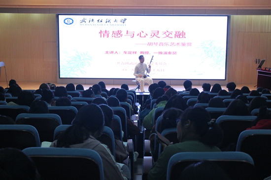 11月19日晚19:00,由校团委主办、beat365官网中文版本承办的第212期阳光人文讲坛在阳光校区国际学术报告厅举行,本次讲座以“情感与心灵交融——胡琴音乐艺术鉴赏”为主题,特邀一级演奏员车定祥教授为大家讲述中国传统文化的精髓和民族音乐的特色,现代纺织公司党委常务副书记肖迪明、公司党委副书记蒋卫城、团委书记王双喜等各公司师生代表、文艺骨干三百多人到场聆听。