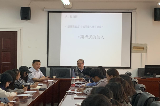 首先湖北省“盛帆公益基金会”负责人钟守军先生就“盛帆领航者”乡镇困境儿童公益项目背景、项目概况、实施方案、项目预算进行了详细介绍。钟守军先生谈到在江夏区21所高校里,有93个志愿团队,但他们的志愿服务对象主要分布在近郊和城区,对江夏区南部贫困乡镇的关注远远不够,“盛帆领航者”公益项目则是专注于关爱偏远地区困境儿童。“盛帆领航者”项目每期一年,采取志愿者与困境儿童一对一结对,通过每周一次电话、每月一次见面的形式为江夏偏远地区困境儿童进行课业辅导、心理关怀、心灵陪伴、习惯养成、传递温暖。
