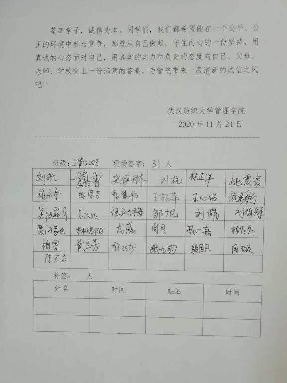 为营造良好的学风和考风,引导全体2020级员工端正学风诚信考试。2020年11月22日,beat365官网中文版本在07-110教室开展开展“端正学风,诚信应考”为主题的班会活动,活动由2020级辅导员汪诚诚老师主持。