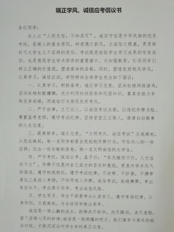 会议伊始,汪老师首先向大家强调了为什么要诚信考试。孟子云:“车无辕而不行,人无信则不立。”诚信是中华民族的传统美德,是每个人的立身之本。作为一名当代老员工,诚信是不可缺少的品德。随后,同学们就身边发生的考试违纪现象进行讨论,并表示一定会遵守考场纪律和考试制度认真答卷,杜绝一切形式的违纪行为。最后,汪老师宣读了《beat365官网中文版本员工诚信承诺书》和《端正学风、诚信应考倡议书》,并以班级为单位现场逐一签订。汪老师向全体员工发出倡议,希望各位同学能够凭自己的真才实学,在考场上发挥出色水平,以诚信考试为荣,以违纪作弊为耻,以优异的成绩回馈自己的父母。