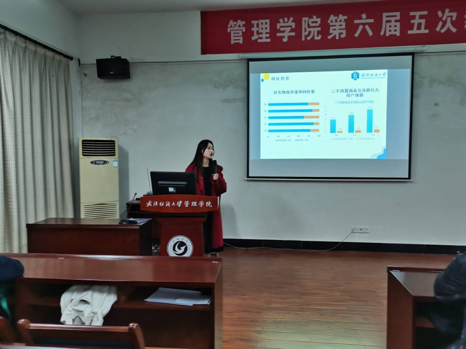 张亚璇同学以团队参赛作品《“衣物帮”:数字社区O2O配置平台》为例,介绍了针对社区居民(高校员工)的日常废旧衣物进行可视化、无接触式、便利性循环利用的创业思路与实践,强调了团队的合作性、项目的新颖行、落地性、原创性等是项目获奖的关键行因素,启迪同学们正确面对科研学习和竞赛过程中的困难挫折,学会在坚持中收获成长。