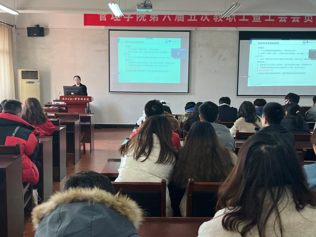 其次,鄢老师就公司寒假放假安排及延迟离校办理手续进行了介绍,并强调离校前安全注意事项。她提醒大家离校前确保宿舍断水断电、锁好门窗、张贴封条;路途中需备好足够的防疫物资,全程做好防护。