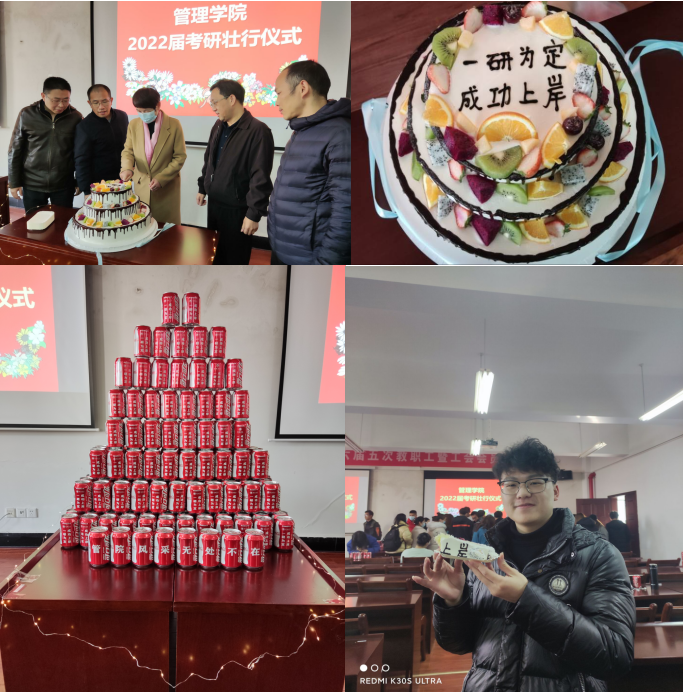 活动最后,公司为现场考研学子们发放了“创意”可乐和蛋糕,师生合影留念,表达了公司对考研学子们的殷切希望与美好祝福。此次壮行仪式,极大的鼓舞了同学们的士气和信心。相信管院考研学子怀揣全院师生的美好祝愿,在研究生考试中一战成硕。