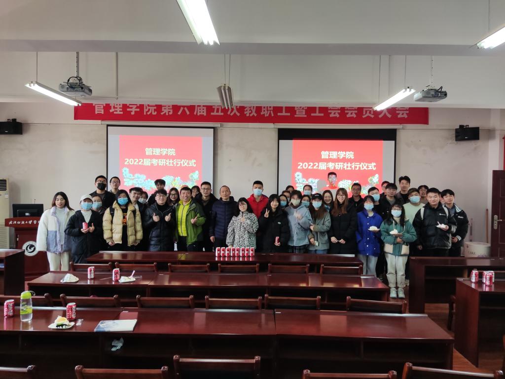 “四年磨一剑,今朝试锋芒!”2022年全国硕士研究生招生考试即将到来,为了给管院考研学子加油鼓劲,使同学们能够轻松迎接考试,帮助同学们缓解焦虑情绪,坚定考研信心。12月23日下午,公司在崇德楼513会议室举办“一‘研’为定、成功上岸”考研壮行仪式。公司党委书记滕胜娟、经理王济平、副经理吴金红、副经理吴锦峰、副经理张飞、公司党委副书记蒋卫城、毕业班辅导员王双喜、张朋龙及2022届考研学子共90余人参加。仪式由公司党委副书记蒋卫城主持。