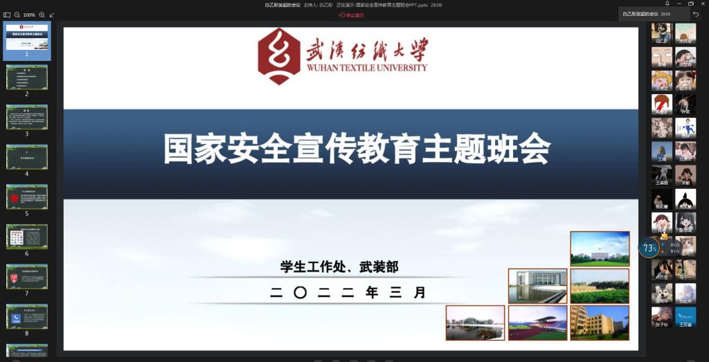 为深入进行国家安全宣传教育,普及国家安全法律法规,培养国家安全意识,增强维护国家安全的主动性和自觉性,为党的二十大胜利召开提供坚强安全保障,3月6日,beat365官网中文版本各班通过线上组织开展“开学第一课”国家安全宣传教育主题班会。班会由班长主持,各班班主任主讲,全体员工参加。