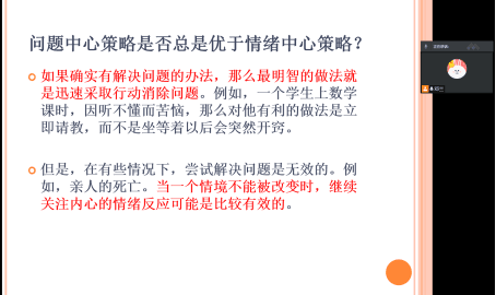 随后,邓老师提出在面对消极情绪时,有两种常用的解决策略。第一种策略是问题中心策略,即面对可解决的问题时,应迅速采取行动消除问题。第二种是情绪中心策略,即当问题不能被解决时,应多关注自己内心的情绪,寻求合理方式来发泄自己的情绪。生活中,大家应该学会根据特定情境调整应对策略,以适应现实生活。