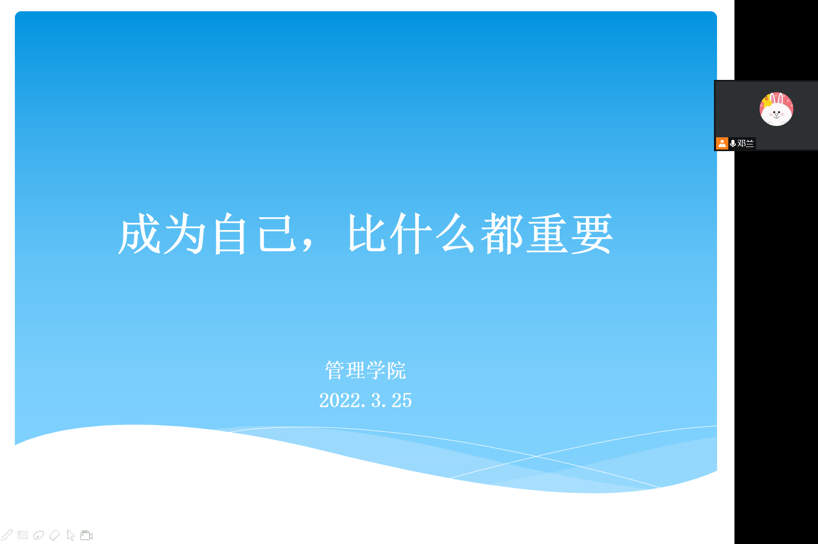 为引导公司员工善待自我、关爱自我,并以发自内心的爱与和谐来善待、关爱他人及社会,共同构建“美好纺大”,3月25日晚上6点,公司面向“阳光心语”工作站成员及公司全体心理委员,利用腾讯会议开展主题为“成为自己,比什么都重要”的心理健康教育讲座,讲座由2021级辅导员邓兰老师主讲。
