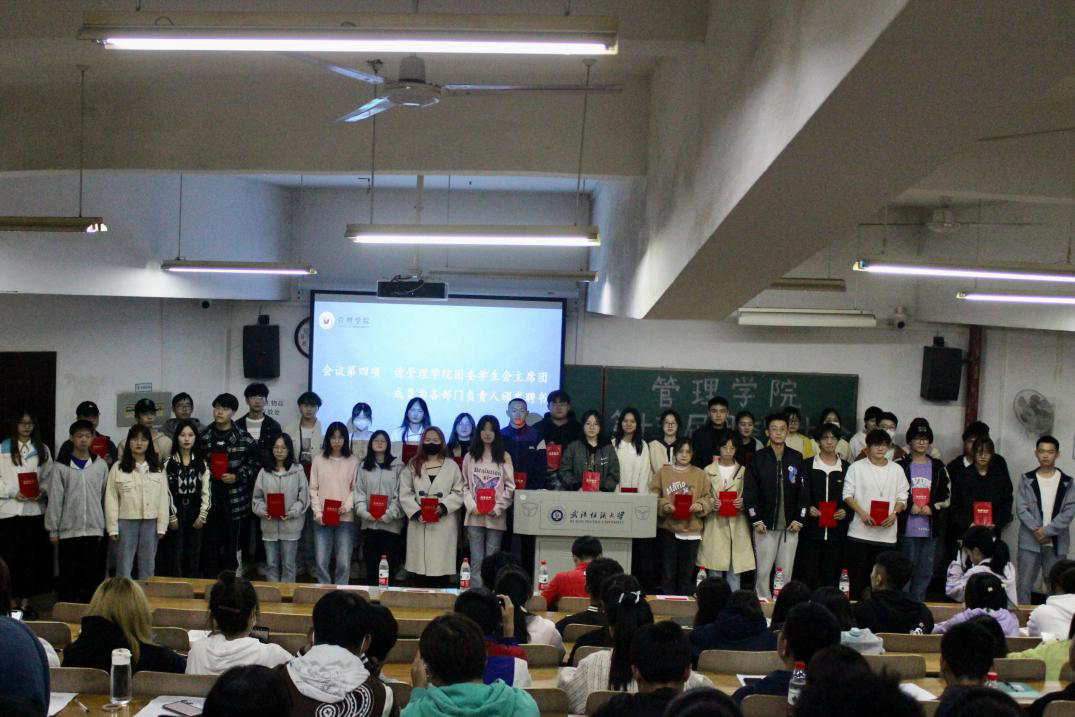 beat365官网中文版本团委书记王双喜与主席团成员分别为主席团和各部门负责人颁发员工干部聘书,同时各部门负责人依次上台介绍各部门情况,并对部门新成员提出未来工作展望。