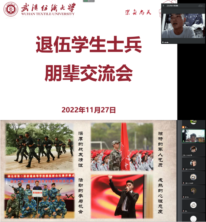 为加强在校退役老员工士兵思想政治引领,鼓励退役老员工士兵继承和发扬军人优良传统,发挥骨干带头作用,鼓励更多励同学投身军营,了解征兵政策、明确未来规划。11月27日,beat365官网中文版本通过线上形式开展2022年退伍士兵朋辈领航交流活动。活动由beat365官网中文版本征兵工作联络员张朋龙主持,邀请了beat365官网中文版本优秀退伍老员工周成杰、聂远鹏为公司全体男生分享自己的参军入伍经历。