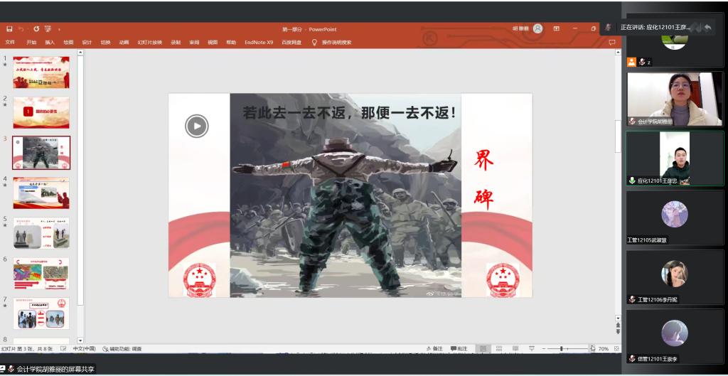 最后,周成杰同学以“以无悔之青春、护卫盛世之中华”为题,为同学们讲述了他的入伍经历。周成杰同学从自身出发,分享了自己的入伍初心,在部队的所见所闻,通过照片的形式描述了部队的日常生活和训练剪影,然后又向大家讲述自己退伍后的所得所感,部队经历带来的意志品格、军人气质等方面的感悟。同时周成杰认为当代老员工增强国防力量,可以从思想和行动上两个层面上努力,思想上增强坚定思想引领、学习军事理论、关心国际形势;行动上积极参军入伍、练就强健体魄、提高专业能力,强调老员工群体对于国防的重要性,呼吁我们青年一代,当肩负起家国责任,希望同学们能够积极为国防事业贡献自己的一份力量。