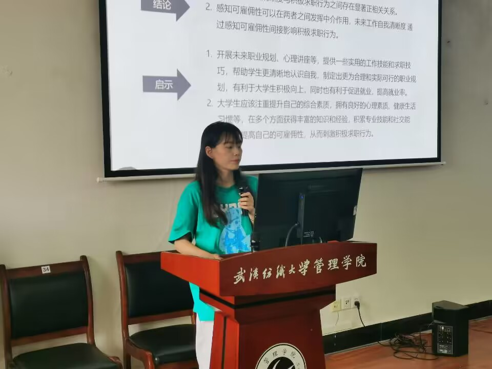 人资11901班张宁婕分享的主题为《未来工作自我清晰度与积极求职行为--感知可雇佣性的中介作用》。她分析得到了未来工作自我清晰度与积极求职行为之间存在显著正相关关系;感知可雇佣性可以在两者之间发挥中介作用,未来工作自我清晰度通过感知可雇佣性间接影响积极求职行为两个结论。