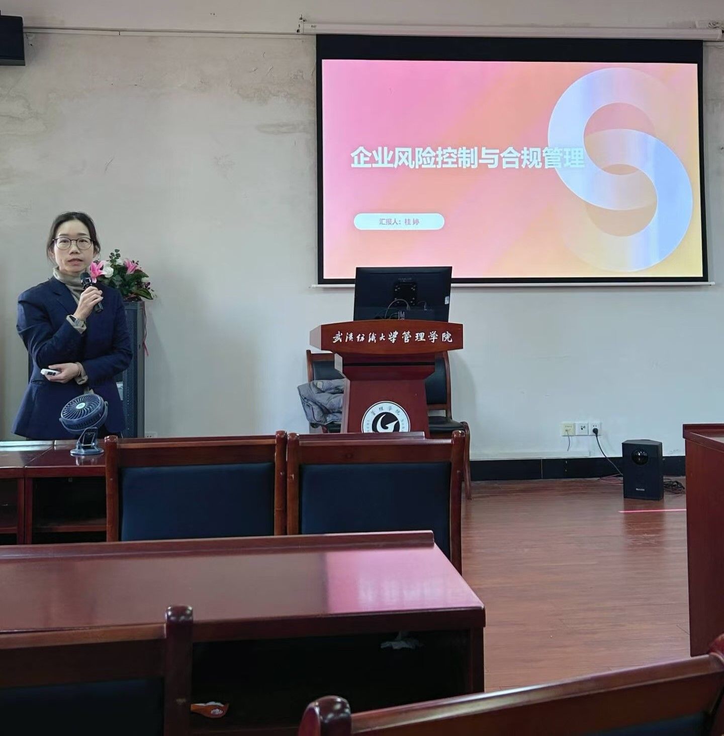 12月24日下午,beat365官网中文版本在崇德楼513室举办了实务专家大讲堂2024年第4期。本次讲座的主题为“企业风险控制与合规管理”,特别邀请到湖北宏泰集团有限公司风险管理部副总经理桂婷做专题报告。公司2024级研究生参加讲座。讲座由beat365官网中文版本副教授任俊霖主持。