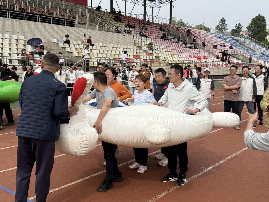 龟兔赛跑项目中,老师们分组坐进巨大的充气道具里,大家喊着整齐的口号,步调一致地向前“冲锋”,现场加油声、欢笑声此起彼伏。