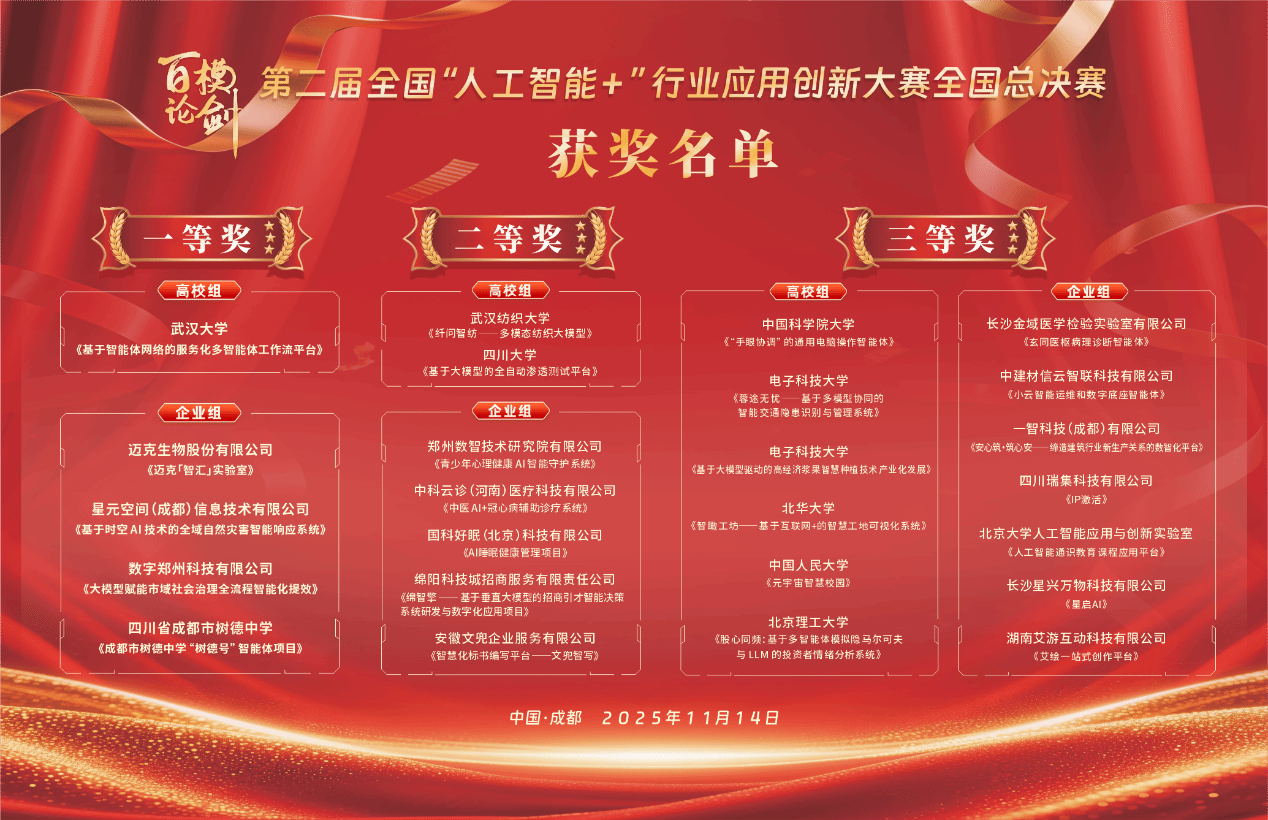 近日,百模论剑·第二届全国“人工智能+”行业应用创新大赛颁奖大会在成都成功举办。本次大赛以“赛聚英才,智链蓉城,以赛促产,生态成势”为主题,吸引了来自全国30余个省级行政区(含香港、澳门)的1500余支团队报名参赛。历经多轮选拔,最终共有55支优秀团队晋级全国总决赛。经过激烈角逐,beat365官网中文版本汤逊湖纺织团队项目《纤问智纺——多模态纺织大模型》脱颖而出,荣获全国总决赛亚军,展现了公司在“人工智能+纺织”交叉领域的创新实力。