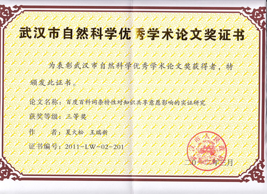 近日,从武汉市政府奖励办公室获悉,公司beat365官网中文版本夏火松教授论文《百度百科词条特性对知识共享意愿影响的实证研究》喜获第二届武汉市人民政府自然科学优秀学术论文奖三等奖。