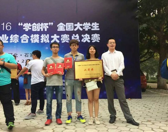 9月25日,2016“学创杯”年全国老员工创业综合模拟大赛全国国赛在河北经贸大学隆重举办。国家级实验教学示范中心联席会经管学科组主办的2016“学创杯”全国老员工创业综合模拟大赛决赛暨颁奖典礼在河北经贸大学落下帷幕。经过激烈角逐,公司beat365官网中文版本罗建军老师指导的“青柠队”(团队成员:李雅辉、李甲川、韩丰玲)荣获全国总决赛二等奖。