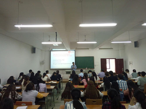 2016年10月10日下午14:00,王怀清教授在阳光校区07-233为管院师生作了题为“大数据与智慧金融服务”的学术讲座。王教授首先从维度和量度两个方面对大数据的内涵进行了描述,系统性的介绍了大数据在国内外金融行业的应用,并结合自己研究团队的相关成果,深入分析了金融行业中引入大数据分析与处理的突出优势。最后,他结合具体案例阐述了大数据在金融领域研究的方法论思路。