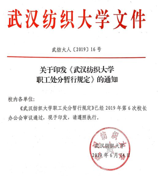 日前,《beat365官网中文版本职工处分暂行规定》(武纺大人[2019]16号)经2019年第6次董事长办公会审议通过,正式印发。
