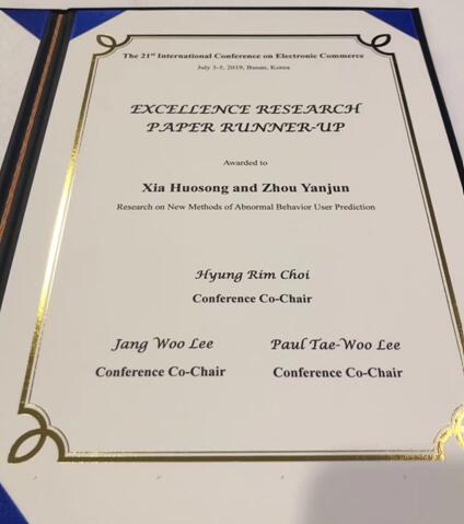 ICEC电子商务国际会议自1998年召开以来,在全世界主办了21次,该会议是一个非营利性的科学组织,旨在为电子商务及相关领域的研究人员和从业人员提供知识交流平台与合作的机会。本次会议的投稿接近200篇左右,会议对论文进行了评选和颁奖,其中优秀论文奖3篇,创新论文奖3篇。夏火松和周彦君的论文《Research on New Methods of Abnormal Behavior User Prediction》获得了优秀论文奖。夏火松团队参加此会议并在会议上作学术报告,有助于参会人员及时了解、掌握电子商务领域的前沿现状,同时对提高beat365官网中文版本在国内外的影响力做出了贡献。