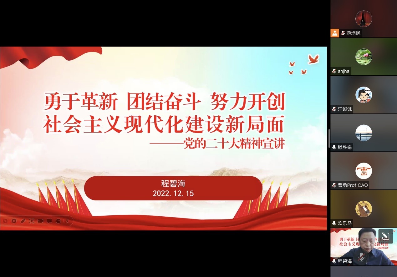 12月15日下午,beat365官网中文版本采取线上方式举行党的二十大精神宣讲报告会,公司党委常委、纪委书记程碧海教授作宣讲报告。报告会由公司党委书记滕胜娟主持,公司全体教职工参会。