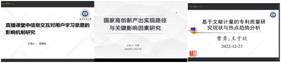 候德林老师又给我们分享了题为《网络直播课堂中信息交互对用户学习意愿的影响机制研究》的汇报,汇报从基于S-O-R理论框架、教学交互层次理论及远程交互理论的信息交互视角探讨了直播课堂中员工和老师行为的影响;随后王雪老师给我们带来了《国家高创新产出实现路径与关键影响因素研究》的相关内容,本研究基于制度、人力资本、基础设施、市场成熟度和商业成熟度五个纬度构建了国家创新系统投入要素和国家创新产出的组态效用分析模型,探讨了投入对产出的影响;最后是曹勇教授给我们带来题为《基于文献计量质量的专利质量研究现状与热点趋势分析》的相关内容,曹教授基于现实和理论需求全面分析专利质量研究现状发展总结提炼了研究热点方向和未来趋势。