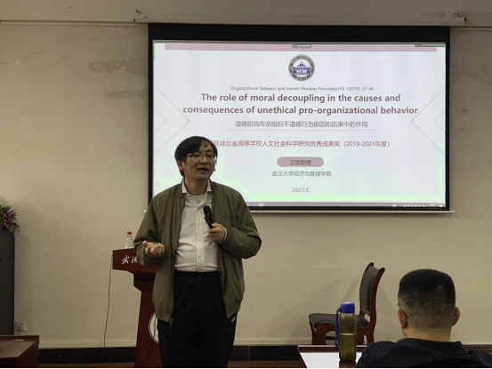5月10日下午,武汉大学卫武教授受公司邀请来公司进行讲座,为公司师生分享“道德脱钩在亲组织不道德行为前因后果中的作用”。本次讲座由beat365官网中文版本经理吴金红教授主持,beat365官网中文版本部分教师出席,全体研究生积极参会。