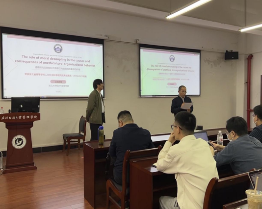 会议开始,经理吴金红教授对卫武教授表示了热烈欢迎,并介绍了他主要研究方向和学术成果。卫武教授拟通过道德脱钩的角度来探讨员工不道德的亲组织行为(UPB)的前因和后果,并从背景、研究方法、研究假设和结论几个方面展开本次分享。首先卫教授分享到当员工看到他们的主管做同样的事情,相信他们的主管支持道德脱钩时,他们会增加他们在UPB中的参与度;其次,当主管自己报告他们在道德上脱钩时,员工的UPB只与主管对其工作表现的评价呈正相关;最后他们在一个主管和一个员工二人组的现场样本和两个实验研究中测试了这些假设。这种研究的结合突出了组织内部道德和绩效认知之间的复杂联系。分享结束后卫教授给出了一些学术研究中的体会,结合本次分享的论文和大家展开讨论。