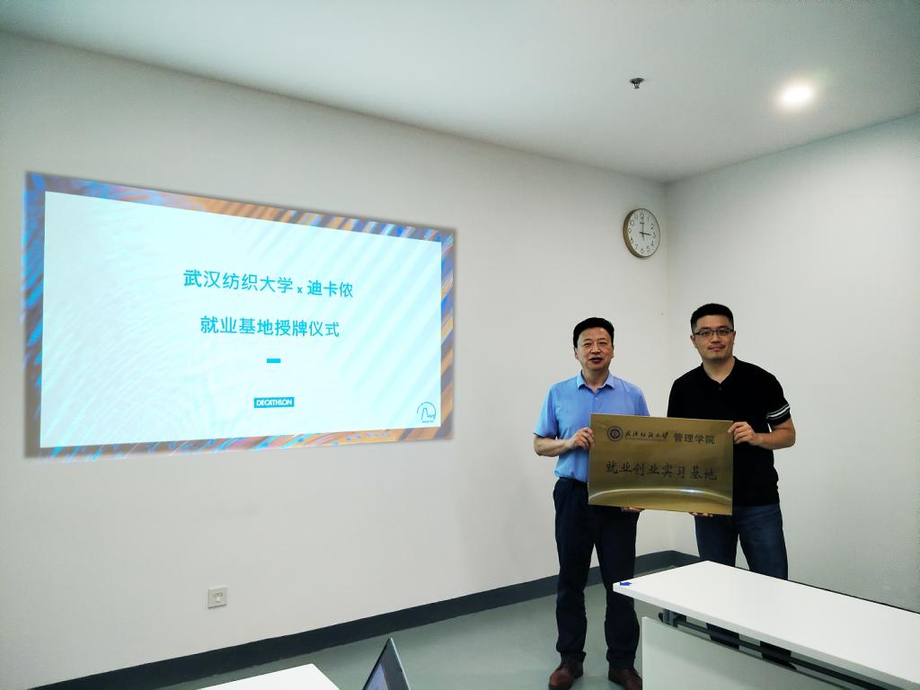 随后,程碧海详细介绍了公司的办学历程、专业设置、人才培养、科学研究、员工特点以及公司近年来发展等情况。程碧海表示,通过此次交流,对迪卡侬企业的产品、企业价值观等方面有了更加深刻的认识和了解。要以本次访企拓岗专项行动为契机,深化公司与迪卡侬的校企合作,充分利用公司在纺织、管理领域的专业与学科优势,进一步探讨校企合作新模式。最后,程碧海为“就业创业实习基地”揭牌,对王晓初等员工心系母校发展深表感谢,程碧海要求公司在毕业生就业、员工实习及校园招聘等方面,积极与员工做好对接,拓展长期稳定的就业合作渠道,为毕业生创造更多实习和就业机会,不断提升人才培养质量,持续推动培养适合国家、社会以及行业的复合型人才。