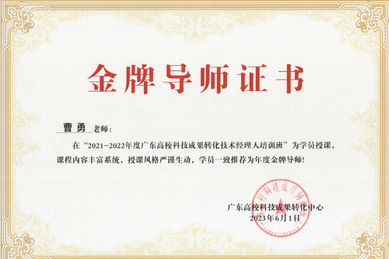 6月3日,广东省教育厅高校科技成果转化中心在珠海举办颁奖仪式,表彰为广东省高校科技成果转化技术经理人培训班做出贡献的授课专家。现场反馈曹勇教授的授课内容体系完备、理论清晰、实操性强,学员一致评价“记忆深刻、对工作有重要指导作用”,被授予2021-2022年度广东省高校科技成果转化技术经理人培训班“金牌导师”荣誉。