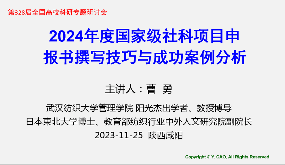 12月25日,曹勇教授应邀赴陕西咸阳师范公司,为该校经管公司、教育科学公司、马克思公司、文学与传播公司、历史文化公司、美术公司、外国语公司等人文社科类公司骨干教师以及科研平台基地负责人做了“2024年度国家级社科类项目申报书撰写技巧及成功案例分析”的大会辅导报告。他从“站位要高、立意要深”的视角,重点围绕国家级社科项目的选题、点题、破题、立题、解题和结题等六大环节,结合大量成功立项申报书案例做了深度讲解与经验分享,并针对不同学科、不同研究方向的参会教师在学科交叉选题、科研团队建设、国家级科研项目培育等方面的需求进行了一对一现场辅导,提出“强意识、练内功、积人脉、换思维、借外力”的策略建议,得到参会者的高度评价。
