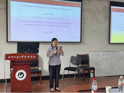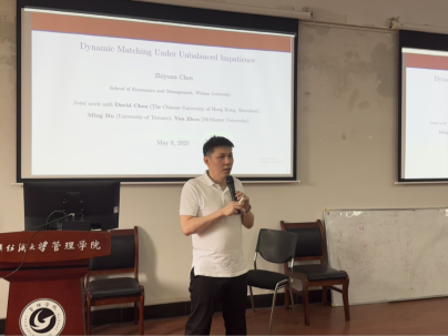 在主题分享环节,三位学者依次分享最新研究成果。陈植元老师以“Dynamic Matching Under Unbalanced Impatience”为主题,深入剖析了在非平衡急躁状态下的动态匹配问题,其前沿的研究视角和严谨的论证引发师生浓厚兴趣。