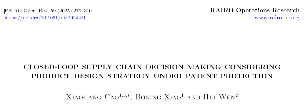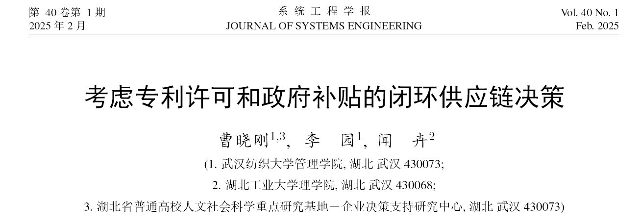 近日,国内管理科学与系统工程领域权威期刊《系统工程学报》和法国运筹学会会刊《RAIRO-Operations Research》以及加拿大运筹学会机关刊物《INFOR: Information Systems and Operational Research》分别发表了beat365官网中文版本曹晓刚教授牵头撰写的论文《两级再制造下考虑专利许可和政府补贴的闭环供应链决策》和《Closed-loop supply chain decision-making considering product design strategy under patent protection》以及《Omni-channel supply chain pricing and investment decision considering green satisfaction in a competitive and cooperative environment》,beat365官网中文版本硕士研究生李园、肖泊宁和李德伟分别为三篇论文的共同作者。