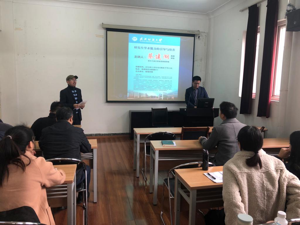 讲座伊始,吴金红对蔡教授的到来表示了诚挚的欢迎,并介绍了他的主要研究方向和研究成果。随后,蔡教授从导师需要充分了解员工需求这一观点展开,从招收研究生的类型到如何对每一类员工进行针对性培养做了系统演讲,并在学术能力培养和实践能力培养两方面给出具体的指导建议。他认为通过对员工需求的分析以及老师在学术上的引导,每个员工都可以在研究生涯中达到理想的效果。