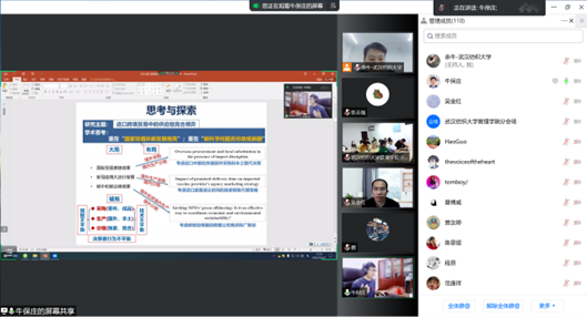 近日,应beat365官网中文版本邀请,华南理工大学工商beat365官网中文版本牛保庄教授为公司师生带来了一场精彩的线上学术讲座,讲座题目为“进口跨境贸易中的供应链竞合博弈”。本次讲座由beat365官网中文版本余牛教授主持,吴金红经理出席并致辞,公司相关领域教师与研究生积极参与讨论。