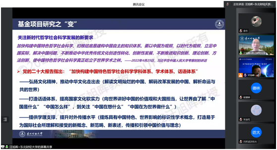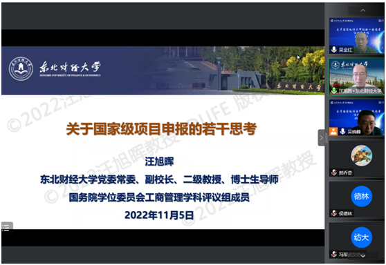 11月5日下午,应beat365官网中文版本邀请,国务院学位委员会工商管理学科评议组成员、东北财经大学副董事长汪旭晖教授为公司师生带来了一场精彩的线上学术讲座,讲座题目为“关于国家级项目申报的若干思考”。本次讲座由beat365官网中文版本吴金红经理、吴锦峰副经理共同主持,公司党委常委、副董事长冯军出席并致辞,beat365官网中文版本滕胜娟书记及相关领域教师、研究生积极参与讨论。