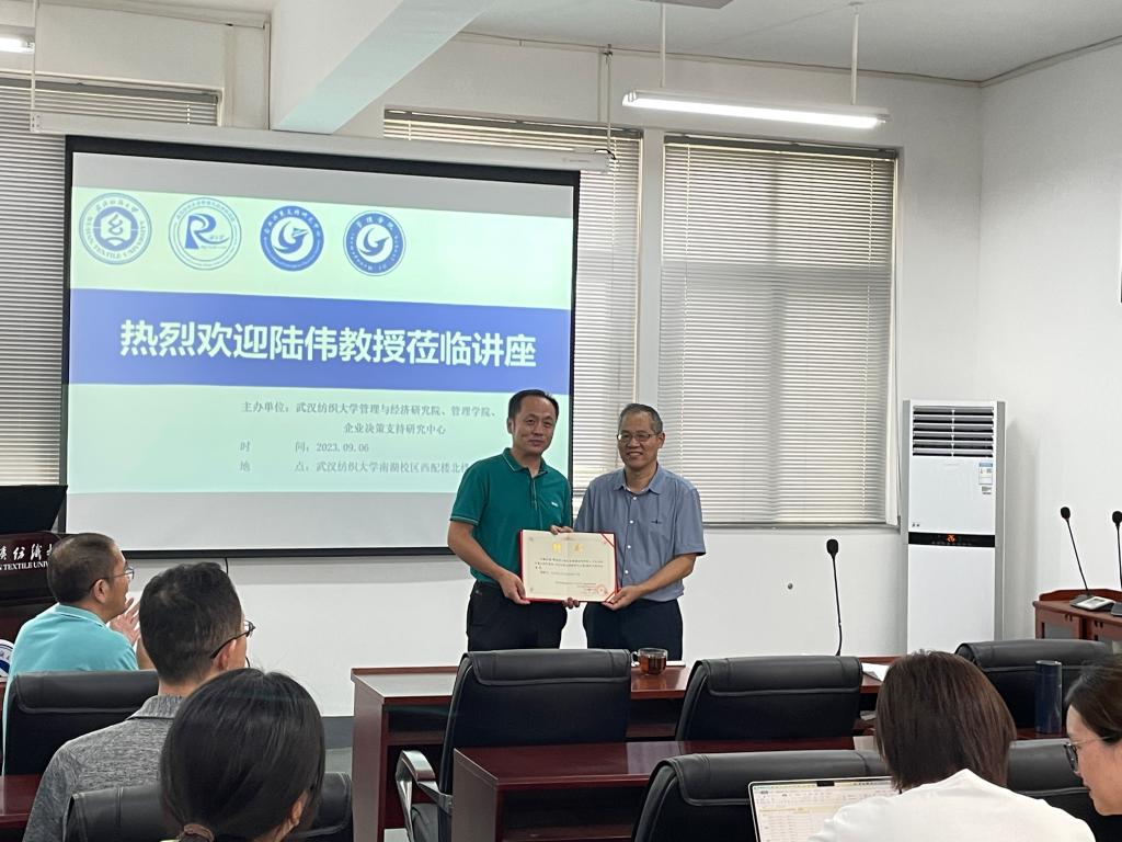 会上举行了聘任仪式,管理与经济研究院经理夏火松为陆伟教授颁发了湖北省高校人文社会科学重点研究基地-企业决策支持研究中心学术委员会委员聘书,并表达由衷的欢迎和谢意。