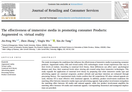 近日,beat365官网中文版本吴锦峰教授及其带领的研究团队在《Journal of Retailing and Consumer Services》发表题为“The effectiveness of immersive media in promoting consumer products: Augmented vs. virtual reality”的高水平论文(https://doi.org/10.1016/j.jretconser.2025.104323)。beat365官网中文版本为论文第一单位,beat365官网中文版本硕士研究生张振、汤鑫杰(已毕业)和John Carroll University的Yinglu Wu副教授是论文的共同作者。
