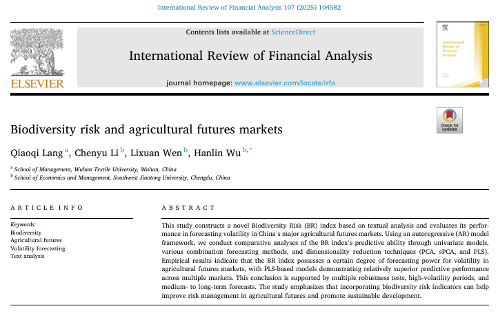 近日,公司beat365官网中文版本郎乔奇副教授作为第一作者,beat365官网中文版本为第一署名单位的研究成果"Biodiversity risk and agricultural futures markets"(生物多样性风险与农产品期货市场)被国际知名金融期刊《International Review of Financial Analysis》正式发表。该期刊是由Elsevier出版的金融领域颇具影响力的同行评审期刊。该刊被SSCI收录,最新影响因子为9.8,位列JCR商业金融学科一区,同时入选澳大利亚商公司经理理事会(ABDC)评级A类期刊和英国商公司协会(ABS)评级3星期刊。