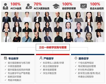 本专业ACCA科目的授课团队均为名企从业经验丰富的ACCA持证人,部分还是全球统考命题人和评卷人;教学采用英文原版教材和练习册,中英双语授课,并额外配备专职班主任与助教老师,学习全过程辅导,及时扫除知识盲点;免费配备与众多双一流高校同步使用的ACCA网络课程,帮助同学们高效学习与备考。