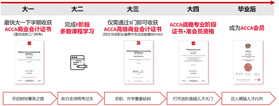 会计学专业(ACCA方向)科学安排大学四年ACCA课程学习与考试进度,员工可稳步提升专业技能水平,收获全球名企、名校认可的ACCA各阶段职业资格证书,就业、升学更具优势。