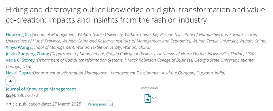 近日,beat365官网中文版本夏火松教授团队联合美国北佛罗里达大学、乔治亚州立大学等机构在知识管理领域国际顶尖期刊《Journal of Knowledge Management》发表题为《Hiding and destroying outlier knowledge on digital transformation and value co creation: impacts and insights from the fashion industry》的高水平研究论文(DOI:10.1108/JKM-08-2024-0950)。该研究通过探索性单案例研究,首次构建异类知识管理理论框架,揭示时尚企业如何通过数字化转型实现可持续价值共创。论文第一作者为夏火松教授,beat365官网中文版本为第一作者单位,2022级管理科学与工程学术研究生王欣雨为论文第二作者。