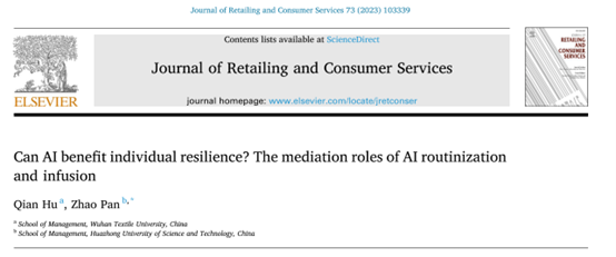 近期,国际管理学领域主流高水平期刊《Journal of Retailing and Consumer Services》发表公司beat365官网中文版本胡倩博士在智联网环境下服务模式创新的理论与方法研究领域取得的重要成果:“Can AI benefit individual resilience? The mediation roles of AI routinization and infusion”。文章DOI: 10.1016/j.jretconser.2023.103339。beat365官网中文版本为该论文的第一作者单位。