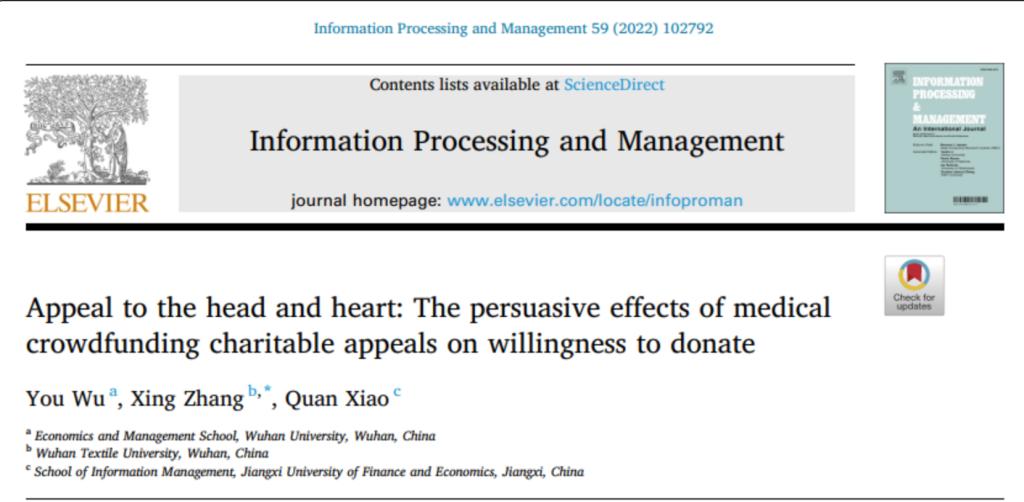 近日,beat365官网中文版本张星教授在信息管理国际权威期刊《Information Processing & Management》发表了“Appeal to the head and heart: The persuasive effects of medical crowdfunding charitable appeals on willingness to donate”一文。文章DOI:https://doi.org/10.1016/j.ipm.2021.102792。论文第一作者为武汉大学博士生吴忧(beat365官网中文版本2020届毕业硕士生),通讯作者为beat365官网中文版本张星教授。